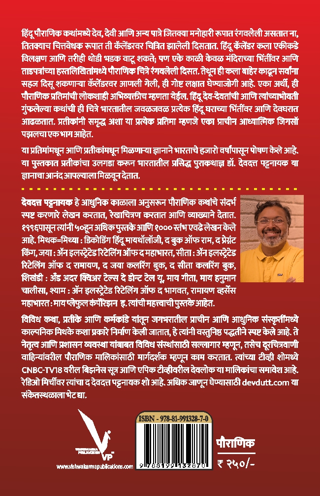 हिंदू पौराणिक कथांमध्ये देव, देवी आणि अन्य पात्रे जितक्या मनोहारी रूपात रंगवलेली असतात ना, तितक्याच चित्तवेधक रूपात ती कॅलेंडरवर चित्रित झालेली दिसतात. हिंदू कॅलेंडर कला एकीकडे विलक्षण आणि तरीही थोडी भडक वाटू शकते; पण एके काळी केवळ मंदिराच्या भिंतींवर आणि ताडपत्रांच्या हस्तलिखितांमध्ये पौराणिक चित्रे रंगवलेली दिसत. तेथून ही कला बाहेर काढून सर्वांना सहज दिसू शकणाऱ्या कॅलेंडरवर आणली गेली, ही गोष्ट लक्षात घेण्याजोगी आहे. एका अर्थी, ही पौराणिक प्रतिमांची लोकशाही अभिव्यक्तीच म्हणता येईल. हिंदू देव-देवतांची आणि त्यांच्याभोवती गुंफलेल्या कथांची ही चित्रे भारतातील जवळजवळ प्रत्येक हिंदू घराच्या भिंतींवर आणि देवघरात आढळतात. प्रतीकांनी समृद्ध अशा या प्रत्येक प्रतिमा म्हणजे एका प्राचीन आध्यात्मिक जिगसॉ पझलचा एक भाग आहेत. या प्रतिमांमधून आणि प्रतीकांमधून मिळणाऱ्या ज्ञानाने भारताचे हजारो वर्षांपासून पोषण केले आहे. या पुस्तकात प्रतीकांचा उलगडा करून भारतातील प्रसिद्ध पुराकथाज्ञ डॉ. देवदत्त पटनायक या ज्ञानाचा आनंद आपल्याला मिळवून देतात.