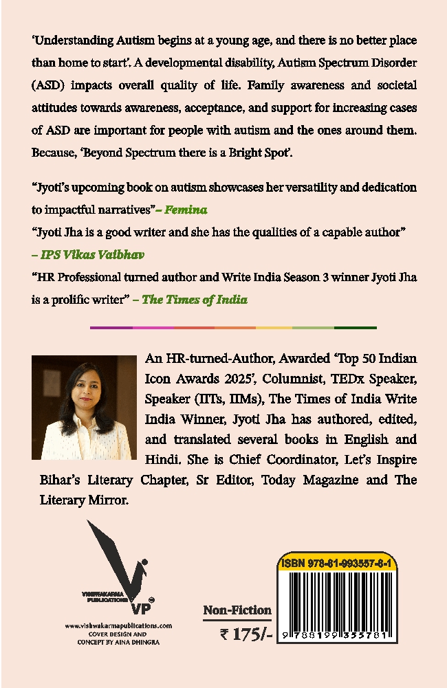 Published by Vishwakarma Publications, this book by Award-Winning Bestselling HR-turned-Author Jyoti Jha, is a non-fiction with information and data mostly collected from parents, caregivers, and individuals managing Autism, and interactions with institutions and organizations who work in the field. Some information is also obtained from online sources (mentioned in the book). The book is meant for informational and awareness purposes only and not intended to serve as a professional guidance for ASD. Including Foreword from Dr. Suneel Godbole, Developmental Pediatrician and HOD, Small Steps CDC at Deenanath Mangeshkar Hospital & Research Centre, Pune, the book has valuable inputs and testimonials from Ms Masarrat Tavawalla, SunderjiтАЩs Global Academia and Prof. Prabhat Ranjan, Vice-Chancellor, D Y Patil International University, Pune. The book has been endorsed with quotations from reputed media houses like Femina and The Times of India. It has also been endorsed by BiharтАЩs popular and celebrated Inspector General of Police and the founder and patron of LetтАЩs Inspire Bihar, Vikas Vaibhav IPS.