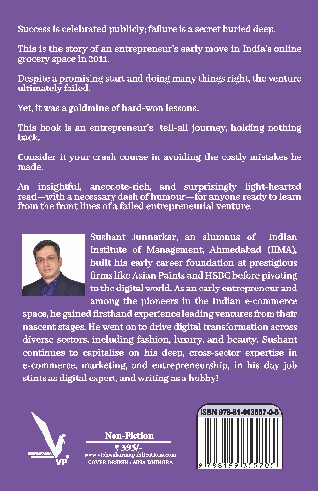 Synopsis┬а: This is the story on an entrepreneur’s early move in India’s online grocery space in 2011. Despite a promising start and doing many things right, the venture ultimately failed. Yet it was a gold mine of hard-won lessons. This book is an entrepreneur’s tell-all journey, holding nothing back. Consider it your crash course in avoiding the costly mistakes he made. An insightful, anecdote-rich, and a light-hearted read- with a necessary dash of humour- for anyone ready to learn from the front lines of a failed entrepreneurial venture.